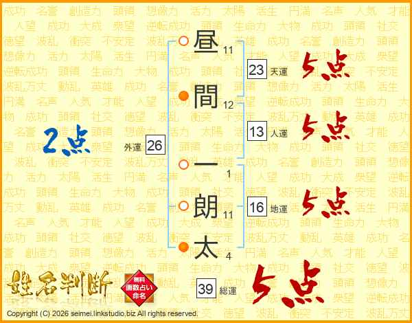昼(11画)間(12画) 一(1画)朗(11画)太(4画)