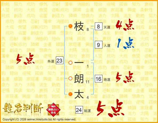 生活面を象徴する運勢です。外部から受ける影響力を表し、結婚運、家庭運や職場、環境への順応性を表します。総運から人運を引いた画数。姓や名が1文字の場合を除く。