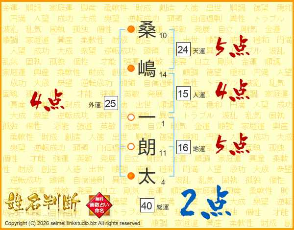 桑(10画)嶋(14画) 一(1画)朗(11画)太(4画)