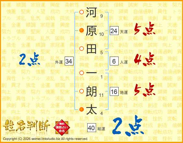 河(9画)原(10画)田(5画) 一(1画)朗(11画)太(4画)