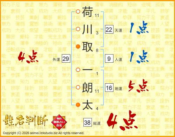 荷(11画)川(3画)取(8画) 一(1画)朗(11画)太(4画)
