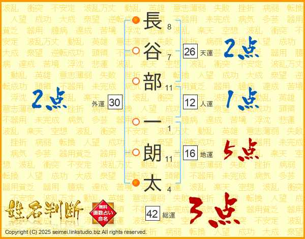 長(8画)谷(7画)部(11画) 一(1画)朗(11画)太(4画)