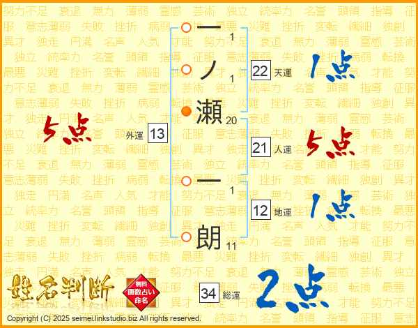 一(1画)ノ(1画)瀬(20画) 一(1画)朗(11画)