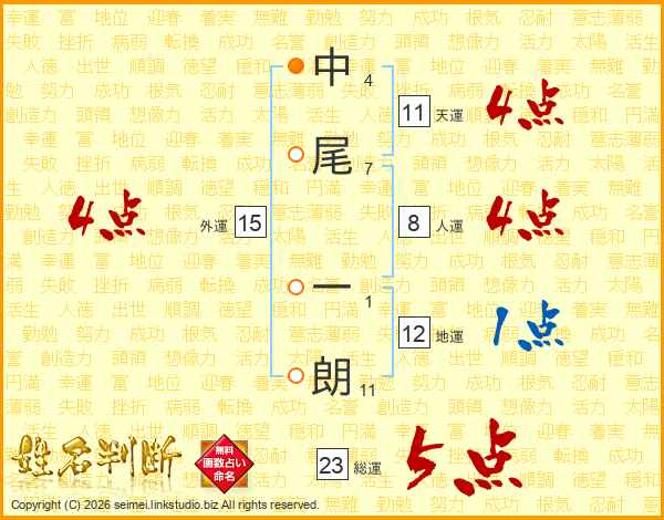 あなたの人生を表す1番重要な運勢です。生涯を通じて影響する総合運となり、主に50歳以降の晩年期に影響を及ぼします。苗字と名前の合計画数。
