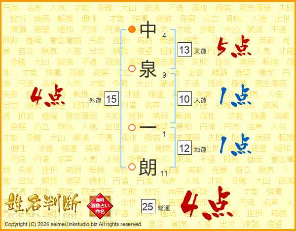 あなたの人生を表す1番重要な運勢です。生涯を通じて影響する総合運となり、主に50歳以降の晩年期に影響を及ぼします。苗字と名前の合計画数。
