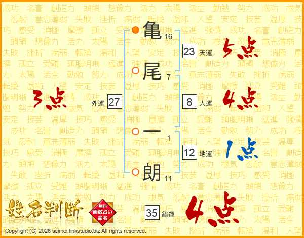 亀(16画)尾(7画) 一(1画)朗(11画)