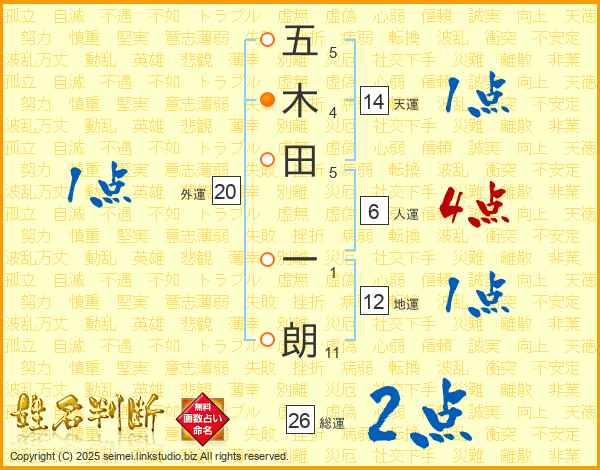 五(5画)木(4画)田(5画) 一(1画)朗(11画)