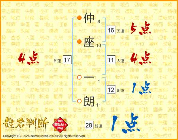 あなたの人生を表す1番重要な運勢です。生涯を通じて影響する総合運となり、主に50歳以降の晩年期に影響を及ぼします。苗字と名前の合計画数。