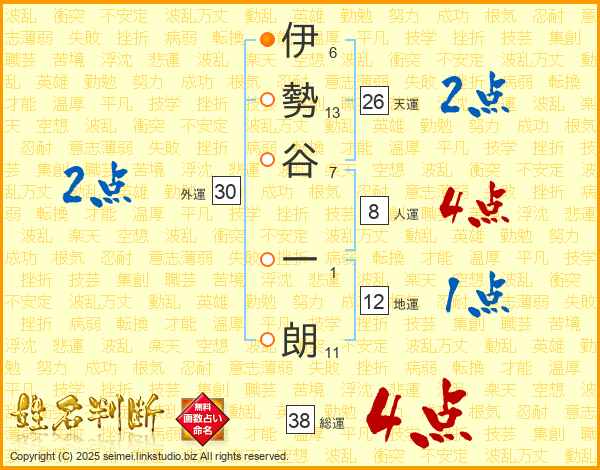 伊(6画)勢(13画)谷(7画) 一(1画)朗(11画)