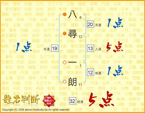 生活面を象徴する運勢です。外部から受ける影響力を表し、結婚運、家庭運や職場、環境への順応性を表します。総運から人運を引いた画数。姓や名が1文字の場合を除く。