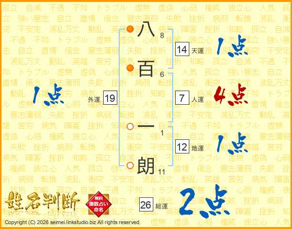 生活面を象徴する運勢です。外部から受ける影響力を表し、結婚運、家庭運や職場、環境への順応性を表します。総運から人運を引いた画数。姓や名が1文字の場合を除く。