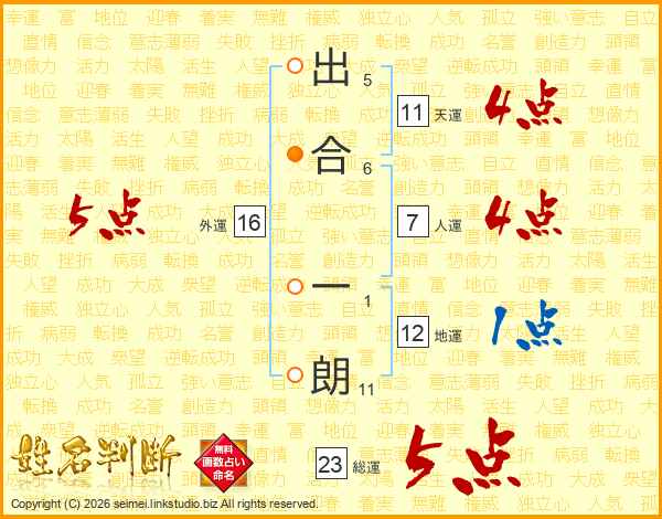 あなたの人生を表す1番重要な運勢です。生涯を通じて影響する総合運となり、主に50歳以降の晩年期に影響を及ぼします。苗字と名前の合計画数。
