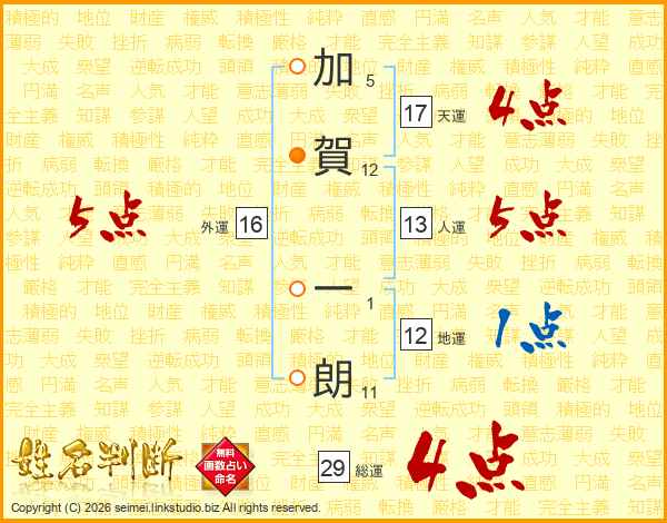 あなたの人生を表す1番重要な運勢です。生涯を通じて影響する総合運となり、主に50歳以降の晩年期に影響を及ぼします。苗字と名前の合計画数。