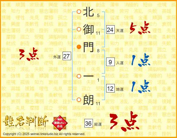 北(5画)御(11画)門(8画) 一(1画)朗(11画)