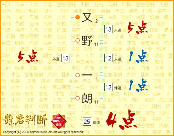 生活面を象徴する運勢です。外部から受ける影響力を表し、結婚運、家庭運や職場、環境への順応性を表します。総運から人運を引いた画数。姓や名が1文字の場合を除く。