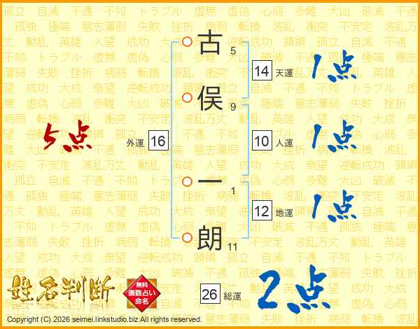生活面を象徴する運勢です。外部から受ける影響力を表し、結婚運、家庭運や職場、環境への順応性を表します。総運から人運を引いた画数。姓や名が1文字の場合を除く。