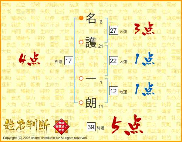 名(6画)護(21画) 一(1画)朗(11画)