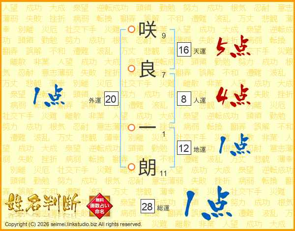 咲(9画)良(7画) 一(1画)朗(11画)