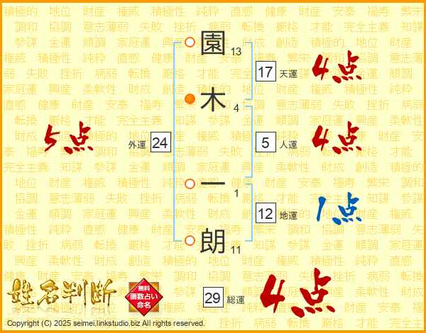 あなたの人生を表す1番重要な運勢です。生涯を通じて影響する総合運となり、主に50歳以降の晩年期に影響を及ぼします。苗字と名前の合計画数。