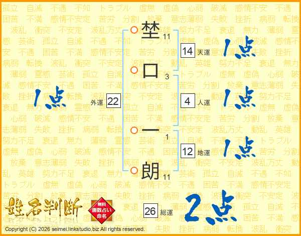 生活面を象徴する運勢です。外部から受ける影響力を表し、結婚運、家庭運や職場、環境への順応性を表します。総運から人運を引いた画数。姓や名が1文字の場合を除く。