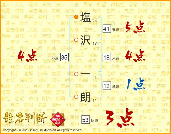 塩(24画)沢(17画) 一(1画)朗(11画)