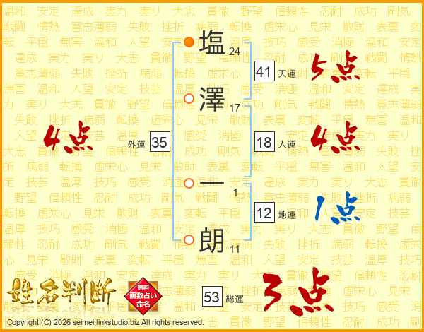 塩(24画)澤(17画) 一(1画)朗(11画)
