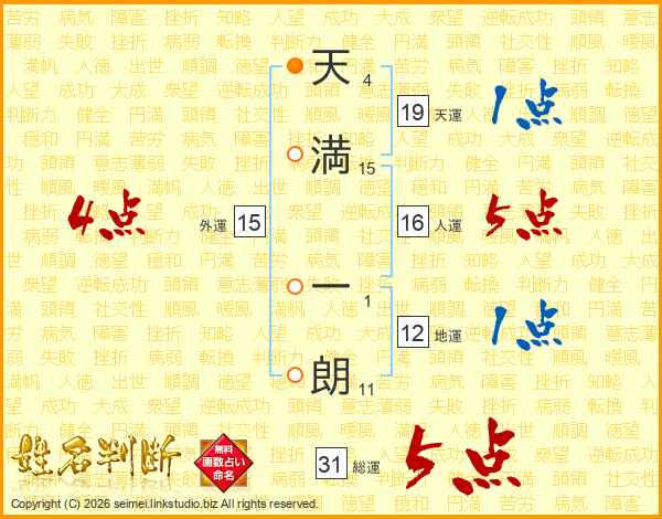 生活面を象徴する運勢です。外部から受ける影響力を表し、結婚運、家庭運や職場、環境への順応性を表します。総運から人運を引いた画数。姓や名が1文字の場合を除く。