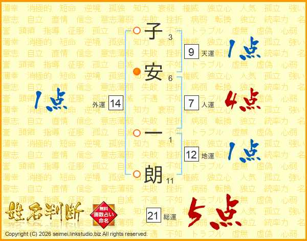 あなたの人生を表す1番重要な運勢です。生涯を通じて影響する総合運となり、主に50歳以降の晩年期に影響を及ぼします。苗字と名前の合計画数。