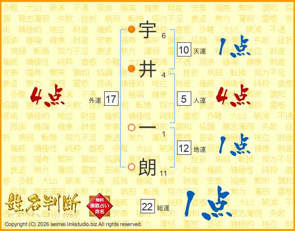 生活面を象徴する運勢です。外部から受ける影響力を表し、結婚運、家庭運や職場、環境への順応性を表します。総運から人運を引いた画数。姓や名が1文字の場合を除く。