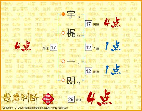宇(6画)梶(11画) 一(1画)朗(11画)