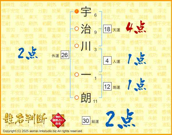 宇(6画)治(9画)川(3画) 一(1画)朗(11画)