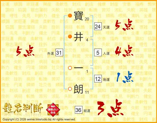 寶(20画)井(4画) 一(1画)朗(11画)