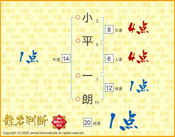 生活面を象徴する運勢です。外部から受ける影響力を表し、結婚運、家庭運や職場、環境への順応性を表します。総運から人運を引いた画数。姓や名が1文字の場合を除く。