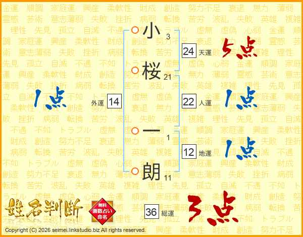 生活面を象徴する運勢です。外部から受ける影響力を表し、結婚運、家庭運や職場、環境への順応性を表します。総運から人運を引いた画数。姓や名が1文字の場合を除く。