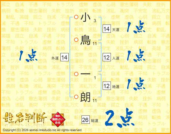 小(3画)鳥(11画) 一(1画)朗(11画)