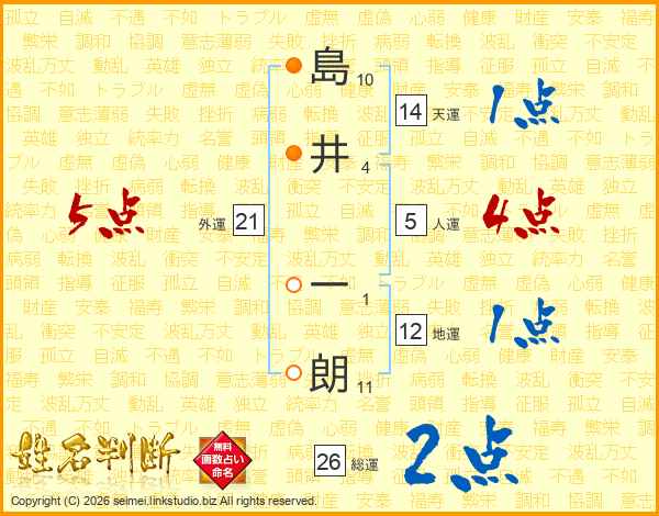 あなたの人生を表す1番重要な運勢です。生涯を通じて影響する総合運となり、主に50歳以降の晩年期に影響を及ぼします。苗字と名前の合計画数。