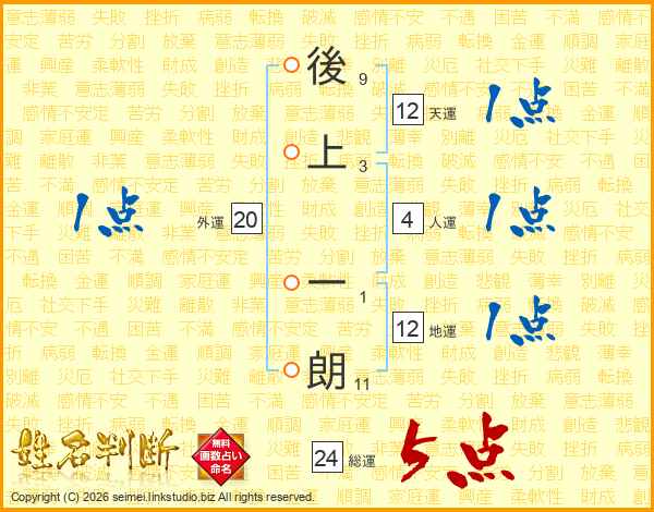 生活面を象徴する運勢です。外部から受ける影響力を表し、結婚運、家庭運や職場、環境への順応性を表します。総運から人運を引いた画数。姓や名が1文字の場合を除く。
