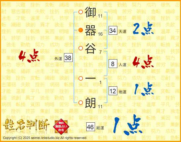 御(11画)器(16画)谷(7画) 一(1画)朗(11画)
