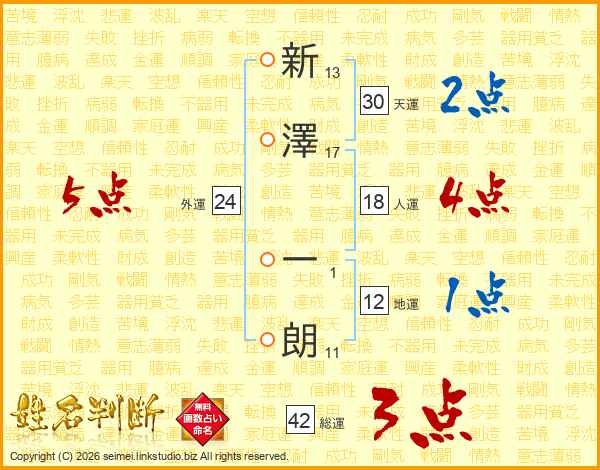あなたの人生を表す1番重要な運勢です。生涯を通じて影響する総合運となり、主に50歳以降の晩年期に影響を及ぼします。苗字と名前の合計画数。