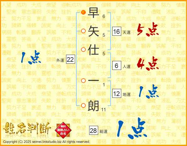 早(6画)矢(5画)仕(5画) 一(1画)朗(11画)