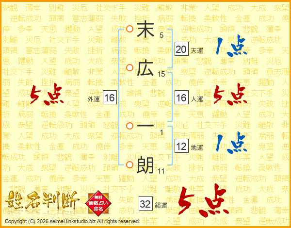 生活面を象徴する運勢です。外部から受ける影響力を表し、結婚運、家庭運や職場、環境への順応性を表します。総運から人運を引いた画数。姓や名が1文字の場合を除く。
