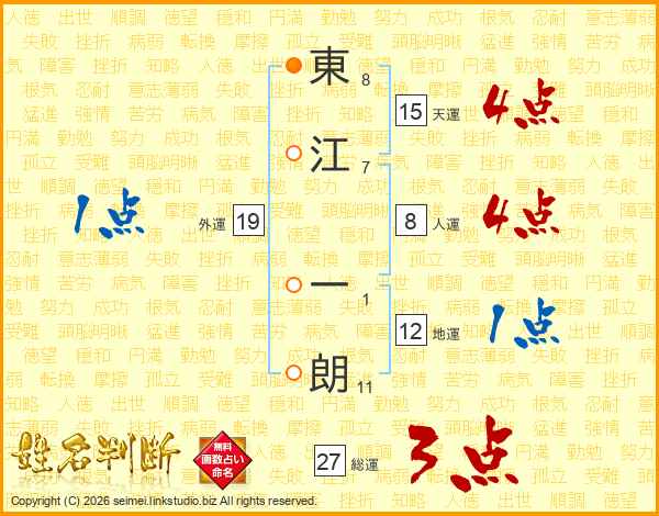 東(8画)江(7画) 一(1画)朗(11画)