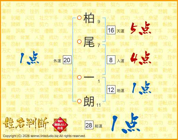 柏(9画)尾(7画) 一(1画)朗(11画)