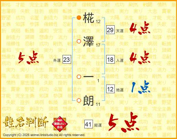 椛(12画)澤(17画) 一(1画)朗(11画)