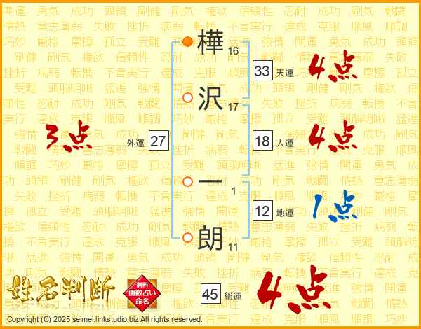 樺(16画)沢(17画) 一(1画)朗(11画)