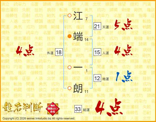 生活面を象徴する運勢です。外部から受ける影響力を表し、結婚運、家庭運や職場、環境への順応性を表します。総運から人運を引いた画数。姓や名が1文字の場合を除く。