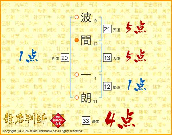 あなたの人生を表す1番重要な運勢です。生涯を通じて影響する総合運となり、主に50歳以降の晩年期に影響を及ぼします。苗字と名前の合計画数。