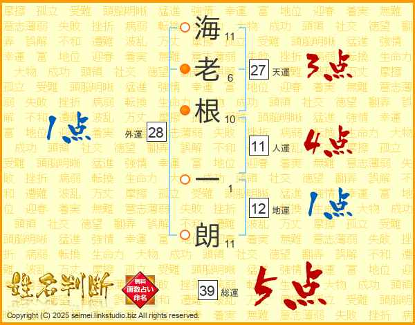 海(11画)老(6画)根(10画) 一(1画)朗(11画)