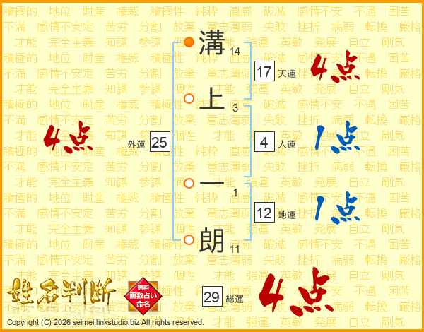 生活面を象徴する運勢です。外部から受ける影響力を表し、結婚運、家庭運や職場、環境への順応性を表します。総運から人運を引いた画数。姓や名が1文字の場合を除く。