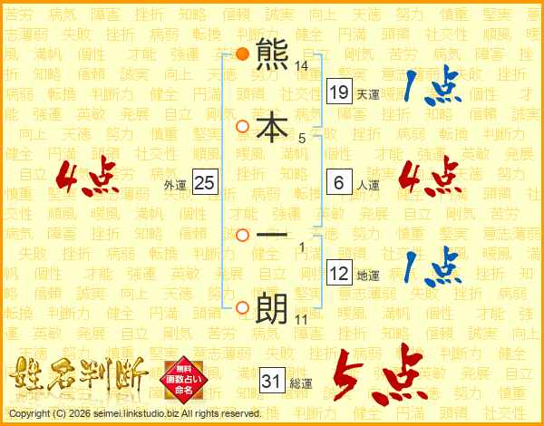 あなたの人生を表す1番重要な運勢です。生涯を通じて影響する総合運となり、主に50歳以降の晩年期に影響を及ぼします。苗字と名前の合計画数。